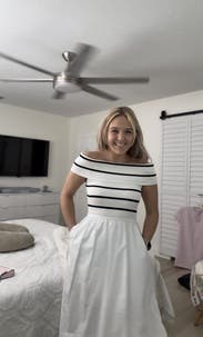 Love love love it. I received it NWT and it’s a perfect fit. The white skirt is not see through and the off shoulder top is so flattering. Might hang on to this one for a little while.