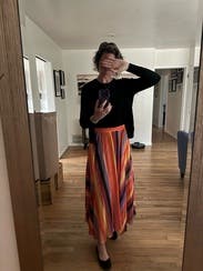 Love the skirt, so easy to dress up or down. Works great with tissues or heels or boots. Second time renting, and will probably rent again!