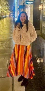 This is such a fun skirt! I originally rented it for work but it’s a little much for the office, so I wore it on a double date. It fit perfectly and was a fun, flowy addition to a rainy evening out!
