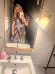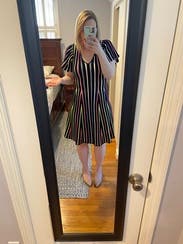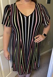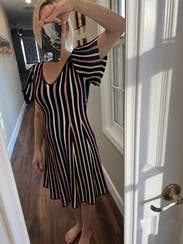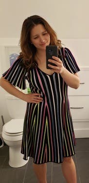 Awesome knit dress! The fabric is high quality and thick, but not too heavy. The stripes add the perfect amount of color. It probably wasn't the most flattering pick for my body 2 months postpartum, but it was incredibly comfortable and I received a lot of compliments on it.