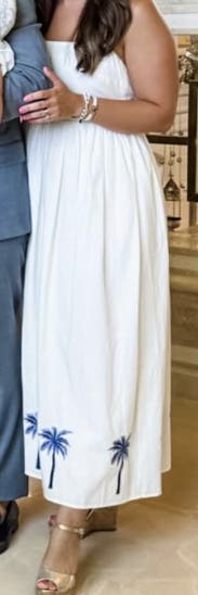 I kept this for several periods thinking I would buy it. The print is great, material was thick and it was extremely comfortable but the top part just didn’t fit right-the darts are too far over to the side and it gaps under the armpit. Thought about going down one size but then the top part would probably just be less material with the same issues. But, the palm trees were so nice.😞 Oh and it was a maxi on me, but they was perfect.