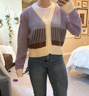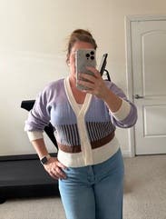 Purple stripe (62% Cotton, 28% Polyamide, 10% Wool). Knits. V-Neck. Long Sleeve. Front Button Closure. Shoulder To Hemline Length: 19". Imported.