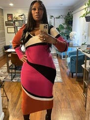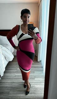 This is a very colorful sweater dress. Form fitting but still work appropriate. The fabric is thick and is definitely better for colder weather. It is very comfortable. Will definitely rent this again.