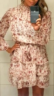 I love this dress! the ruffles were so fun and I wore this dress more than once. I dressed it up for a date night w heels & down with sandals. I said it ran large because I ordered an XS and it was still a bit long on me and I had to tie the waist band pretty tight. So if you're in between sizes, I would say go with the smaller one.