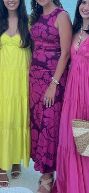 I ended up not wearing this because I think the other dress I rented was slightly more dressy. This dress is so comfortble. Meshy (but lined!) and strechy, with just the right folded material around the mid section. Great colorful! I think this dress would be good for more casual wedding or night out. Not super formal becuase of the material.