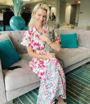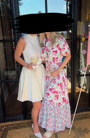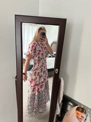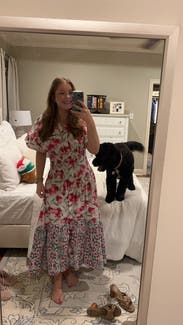 The fabric on this dress was beautiful. The main body is a warm pink and grass green floral pattern almost like tulips. The bottom is a contrasting cool toned magenta and teal floral pattern. The underbust through hip area is smocked so fit is effortless. There is very little structure to the smocking so it will show every bulge - I opted for spanx. For this reason, you can pull the dress on over your head as well. The buttons only function to the bust. The length was very long on me- it nearly dragged the ground in flats. The hem got wet when we ran into a flash shower. Overall the dress was fine, but a little finicky for me between the smocking, length, and fabric that needed to be steamed.