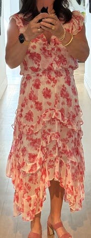 I wore a medium and it was a tad snug but that was to be expected because I’m usually a large. However it really wasn’t a problem, especially with Spanx which I also recommend because the dress is pretty sheer. I got lots of compliments, and the pink is lovely for a spring/summer wedding. It’s light as well so is good in the heat.