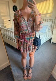 Would have bought it if it wasn’t so pricey! Such a fun pattern and cut. Shorter so wore boy shorts underneath and it’s also very low cut, wore it with a strappy tank underneath it.