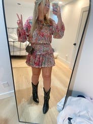 This dress is so fun and different! The low cut top with a cinched waist was so flattering! Perfect for a country concert! Loved it!