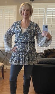 I loved this fabric and color but I knew it would be too short for me so I decided to wear it as a top. It was so beautiful when paired it with some skinny jeans. Hubby and strangers loved it. I did wear a camisole under because the girls would definitely show with how it’s cut if you have anything up top. I think for work I’d just do black straight leg pants with pumps — but either way it’s just a gorgeous fabric and light feminine look!