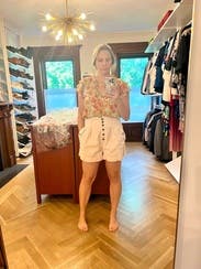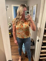 If you've got some cleavage going on and are in the mood for showing it off, this shirt is a great option. I found it super flattering in that way. However, when I sat down, I did notice my bra showing a little bit. If you want to be a little more conservative, it would look nice with a bralette, cami, or bandeau underneath.