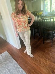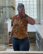 Love Misa! Pretty spring top perfect to wear with khakis. Pretty gold sparkle. Good fit…not too boxy and not too long. Flattering!