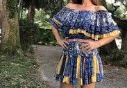 I rented this dress for my vacation. It was great! Beautiful, fit great with stretch in the shoulders and waist. Very forgiving. It's mini but a tad longer in back, loved it. I wore it out, mid-day in Maui-- I was hot af, in the fabric which is a poly blend, not going to lie. But I felt soo cute.