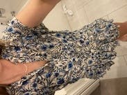Light and airy. Great for warm weather. Pretty blue print. Fits great. The stretchy waist is nice. It gives you a little flexibility to pull the bottom half down just a bit without ruining the look. Pretty short. Will rent again.