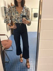 Super cute top! Wore with jeans for a more casual, drinks out kind of look. It's super open and low, so I had to wear a little tank under it. Got tons of compliments on it! The sleeves are cute, you can wear them down or push them up.