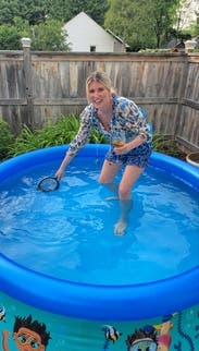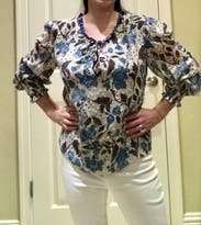 The shirt was a little unusual for me. Untied it has a nice low neckline and was great for a neighborhood concert. Afterwards for dinner I did tie it up because I thought it was a little too revealing. One of the waiters told me it was an amazing color on me. But honestly it just felt a bit frumpy and aging. I got a compliment and that doesn't happen very much with my normal wardrobe so that's something!