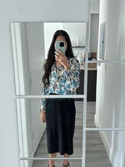 High-quality, pretty and just a little sparkly. Wore this a lot. It's loose but the waist is straight, not flowy, hits at the hip. So size up if need be. The small fit just right on a petite