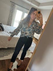 I wore this twice for work. I wore it as a regular blouse at the office paired with some high waisted black trousers and again to a more formal happy hour for work. Only note - it is very low cut. I am small chested and wore it with a bralette underneath so no issues, but for anyone that's a little busty this may be a little too revealing. The print is lovely and the cut is flowy and so comfortable!