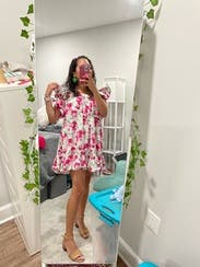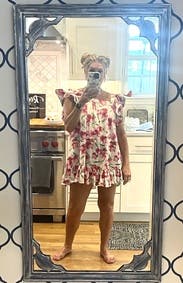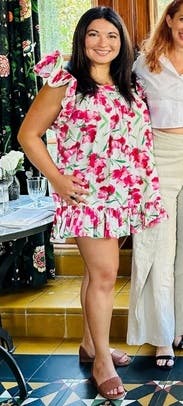 Wore for Mother’s Day brunch- not the most flattering style- but so cute! The ruffles are structured and make the dress extra special. Could have easily sized down! Overall loved it!!