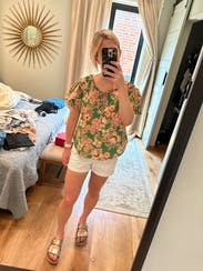I really enjoyed this blouse. The style, fit, and colors were a great pop of spring/summer. Wore with jean cutoffs and sandals.