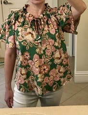 Green floral cotton (100% Cotton). Top. Cap sleeves. Tie neck. Tie closure. 24" from shoulder to hemline. Made in the USA of imported fabric.