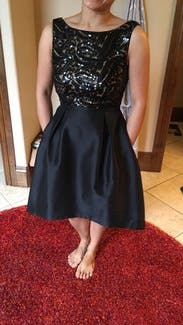 Got a lot of compliments, this is just a classy black dress! Didn’t even need to steam it when it arrived at the hotel for a graduation ball. And it has pockets! I normally wear a four and this time I wore the six and I couldn’t wear a bra, but it was very formfitting and I didn’t need one. The sequins were not itchy, I have a hangup about that!