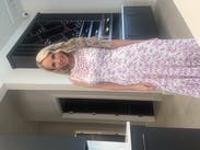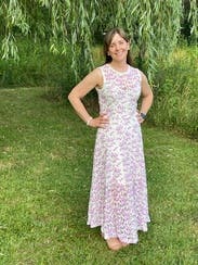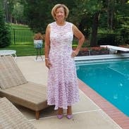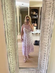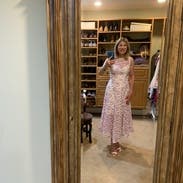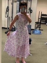 First, excuse the funky photo, but the gym was the only place I had a long mirror! Even the woman stocking shelves in the grocery store stopped to tell me "how pretty your dress is." The skirt is full (see photo) and the top was a great fit. Perfect for a date, a wedding or simply to feel pretty on a summer's day. One note: the fabric catches on things easily, but I soon figured out how to avoid that.