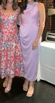 Great option for people with an inverted triangle body type, a short torso, or a full bust (I’m all three). Runs very much true to size. I would say the color is lilac with a hint of pink. The dress was extremely comfortable for a long night of dancing, I didn’t have to fuss with it at all. I didn’t wear a bra and felt fine without one, but the dress will easily accommodate a regular bra. I would absolutely rent this again and would even consider buying it since it’s so rare to have something fit me so well.
