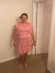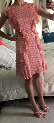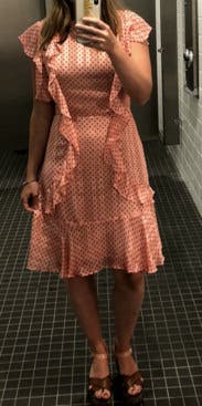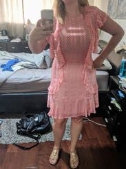 The color is neat because it looks peach in some light and very pink and others. It has very subtle striping in the texture of the fabric which is pretty. I thought the cut was maybe not the most flattering for my body because it made me look a little bit thick, but it was so frilly and cute, I didn't care. I wore it to work but I thought it would be the perfect baby shower dress or for Valentine's Day. A frilly, fun wear.