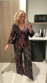 Great fit, a little long (I’m 5’6” and only the 16L was available) with heels, but doable. The jumpsuit is HEAVY from all the sequins. Opted for a bralette to reduce cleavage. Received so many compliments, and it was a fun look for the fundraising gala I attended!