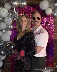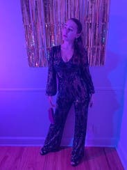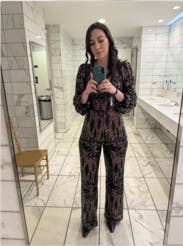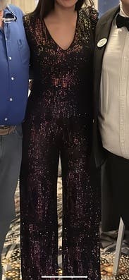 Wore this to a black tie charity gala. Very fun jumpsuit and definitely made me feel ready to party. Fabric is stretchy and comfortable. Sequins were pink and blueish on black background. Really pretty. I am 4 weeks postpartum and loved that the fit wasn’t too clingy and I could wear a real bra. Would rent again. I rented the 16 tall. I am 5’9”, wore 3 inch heels and still had extra length in the pants. I normally have issues with torso being too short in jumpsuits, but the tall size fit great.