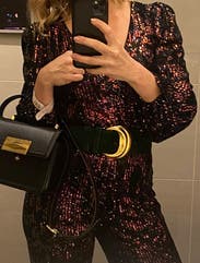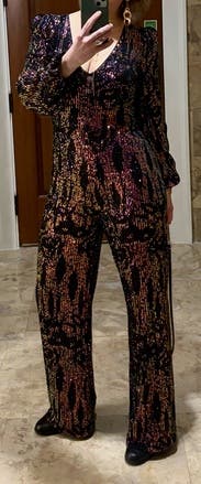 This jumpsuit was the perfect pick for a disco-themed holiday party. I got so many gushing compliments and felt amazing! It is lined so the sequins don’t rub you raw yet breathable enough that you don’t overheat. The sequins do catch some, but not as much as other sequined items I’ve worn. As other reviewers mentioned, the zipper is a little tricky to get on your own but not troublesome enough to prevent me from renting again. A great find if you can get your size!