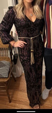I'm tall but most of my height is torso rather than leg, because of this I'm always skeptical about jumpsuits, rompers, one piece swimwear etc. Because it always seems like they make the long length for leg-tall people not torso-tall people like me. This jumpsuit in the 16L was the perfect length in both so I could still wear heels and not have a camel toe and it had just enough stretch. I did wear Spanx with it to smooth me out and because I thought it might be a little see-through, but it isn't. I also thought the sequins might be itchy but they weren't. The only thing I was slightly meh about was the elastic sleeves. I wore it to a super fancy wedding and got SO many compliments! Highly recommend, it's a magnificent piece. I seriously contemplated purchasing it and keeping it forever, but I just don't know when I would ever wear it again!
