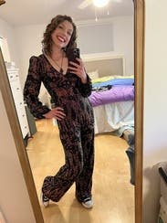 I love this jumpsuit and wish I had good reason to keep it in my wardrobe! I wore it to an LGBTQ+ black tie benefit, and it couldn’t have been more perfect. I could turn a corner without someone complementing me. The sizing was perfect, it had just the right amount of stretch, and it was comfortable for the whole night. If you’re a tall lady, I recommend going for the long if it’s available - I would have preferred it, because I love the legs to be more floor length, but it nothing to sweat over. There is more bronze coloring to it than I expected, and the blue is a richer tone than it seems as well. Killer for a red head! Great find!