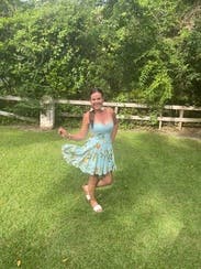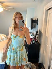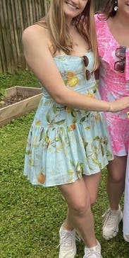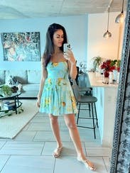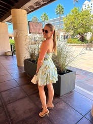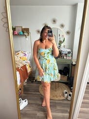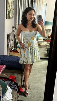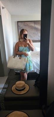 This dress was INCREDIBLE! Wore it to a beach wedding, got so many compliments, and was so flirty and fun! The pattern is cute and perfect for summer, and the top didn’t slide at all (I was worried with the no straps). I didn’t wear a bra and still felt comfortable in the dress. So fun to dance in and super forgiving to the middle area (if that’s something you’re concerned about)!