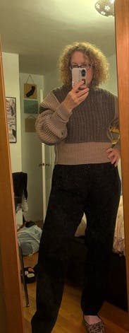 I loved this sweater SO MUCH! It fit me really well, at 5’11” and with disproportionately long arms even at that height. It was bulky through the shoulders and hard to get under a winter coat but it was such a unique piece that I didn’t mind. It was also very comfortable for winter weather and wearing at home, for those of us in cold climates who aren’t cranking the heat. I wouldn’t recommend for anyone who is short or has shorter arms - you’ll be swimming in it. Not sure how this would look for someone with a bigger bust, tbh. Paired well with black jeans and beige trousers, plus leggings for around the house. I am likely to rent again!