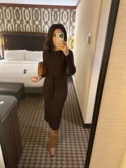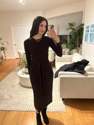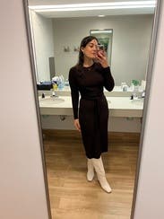 Perfect sweater dress! Fit like a glove and was very comfy. I did not wear the belt as pictured in the RTR picture