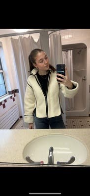 I just got this delivered and might buy it. It’s fleece lined which makes it so cozy. The sleeves are quite wide but I like that if you’re wearing layers underneath. Only complaint is there are no pockets- but otherwise it’s a very chic jacket. I took a small and found it perfectly oversized.