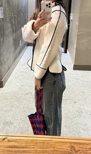 I was so excited for this jacket, but it was so small (at least 2 sizes too small). The collar and all edges were warped and turning out. It’s as if someone put this in the dryer. I’m so sad. This could have been so cute if it looked how it does in the model’s picture.
