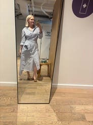 Has the unique features we love about Monse. I got a 6, and I probably needed a 4, so I styled it with a belt. Also the front area has weird buttons. Both inner and outer, and it seemed to kinda gap open. The fabric was nice. Not as wrinkly as some other shirt dresses.