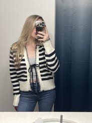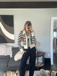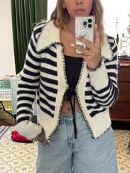 The Striped Sailor Cardigan by Moon River features a classic navy and white striped pattern with a cozy, relaxed fit. This nautical-inspired piece is perfect for layering over casual outfits, offering a touch of charm and warmth. Pair it with denim or a simple dress for a laid-back yet stylish look.