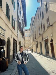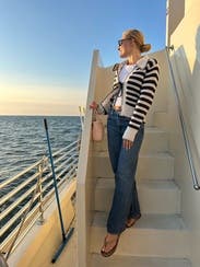 This sweater was so cute for a coastal vacation. Would we perfect paired with a navy tank top under, but i only had grey and that worked fine too