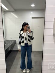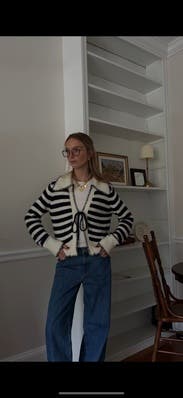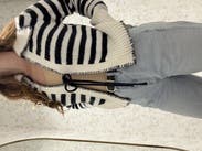 Cute, nautical sort of sweater. I wore with a camisole underneath but a thin long sleeve might help with the itchiness