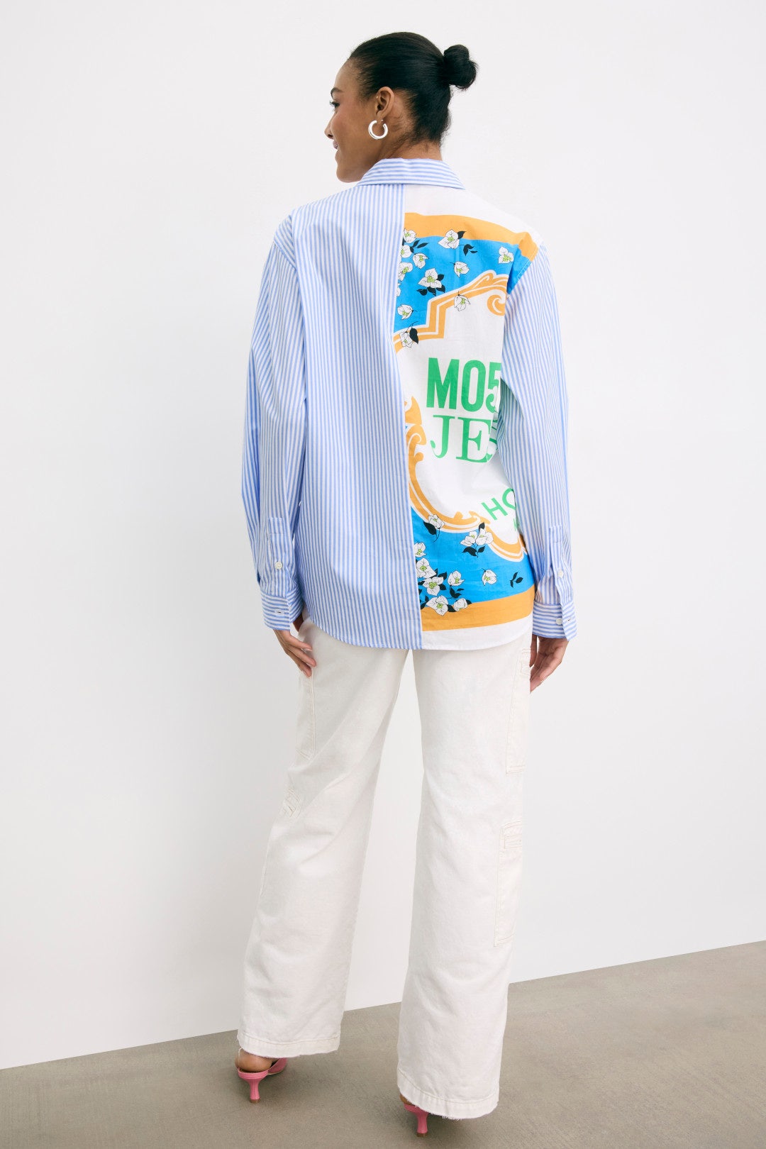 Moschino Jeans' Striped Poplin Shirt features vibrant multicolored stripes on soft cotton poplin. For a stylish look, tuck it into high-waisted jeans and add loafers.