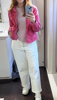 i like a slightly oversized denim jacket on the assumption they were designed for cool weather and could handle a long sleeve layer underneath. this wasn’t the case with this pink (too snug in chest and shoulders) number which is interesting bc the pants run big ¯\_(ツ)_/¯ i wore the matching set for a nice dinner and it was a vibe but wouldn’t rent again. i’m a 34d for reference. may work better on folks with a small chest and/or more delicate frame.