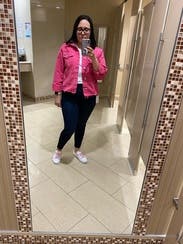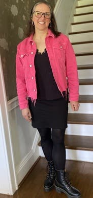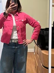 Wore to Barbie movie and later to lunch. Easy to wear with fair amount of stretch. Has a traditional jean jacket profile with frayed edges. Fit well across my broader shoulders. Great bright pink color to wear over black.