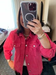 Pink denim (98% Cotton, 2% Spandex). Jacket. Front button closure. Made of imported materials, finished in the USA. 21" from shoulder to hemline. Country of origin designation as provided by vendor and/or manufacturer.