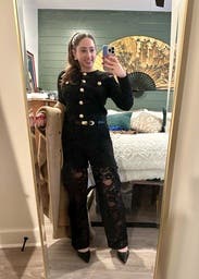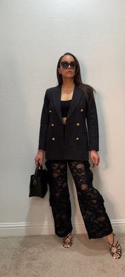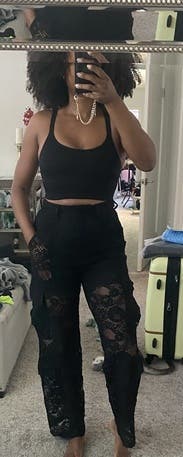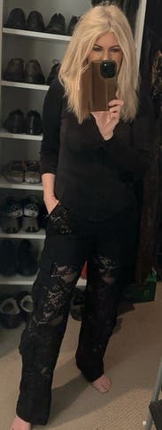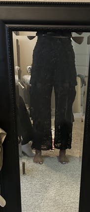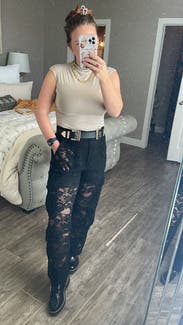 These pants caused quite the commotion! They were disarmingly fun and the sheer lace were perfect to dress up or down . I wore with both a body suit and a coupe blouses to dress up . I also wore with heels and fun sneakers. So many compliments!!!!!