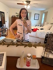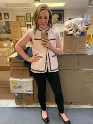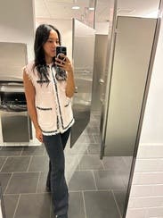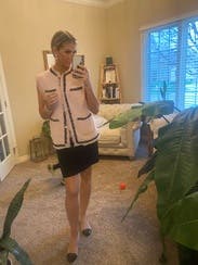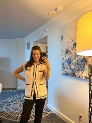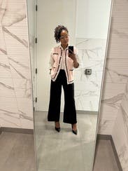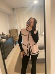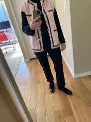 Paired really well with my Chanel bag and shoes. Next time I'd probably wear it with white pants but I love this. Could also wear unbuttoned but thought it looked better buttoned with the back pants. Will definitely rent again.
