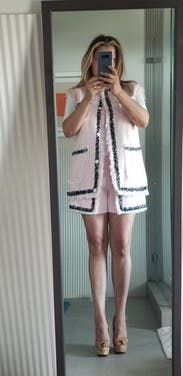 I wore this w white pants, skirts, & shorts w shirt underneath & alone. Also rented shorts which was a cute set but I preferred it alone. Great for spring. I struggled to send this back & almost bought it. It's a soft bubblegum pink w white tweed & black accents. Considered for a May trip to Spain but I pack carry on only & this would take up WAY too much room in luggage.